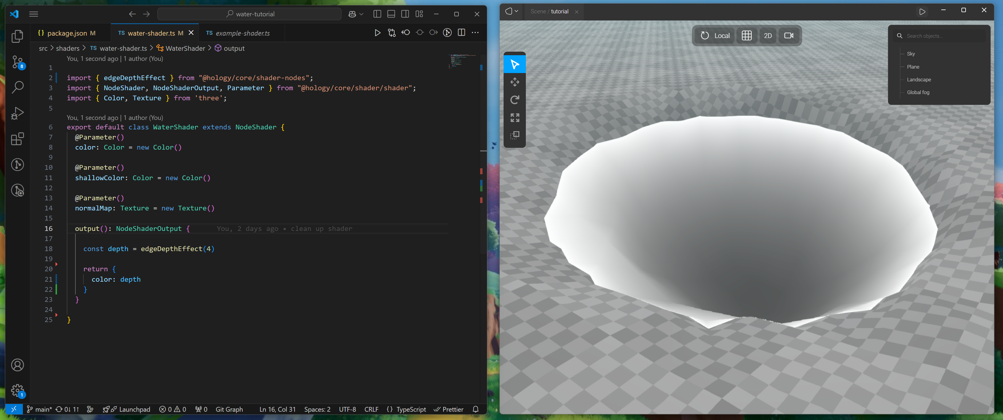 To make the water appear more realistic, we want to adjust the color based on the depth, making it look murkier the deeper it is. This can be done using a built in function `edgeDepthEffect(power: number)` . This function will return a number between 0 and 1 where 1 means that the fragment behind the fragment we render is at the same distance from the camera. This can be useful to calculate a different color or opacity where a geometry intersects with another or based on depth. The number given as the argument to the function is an exponent that can be used to create a sharper edge detection. In your shader code, we can replace the content of the output function with the following code. We can output the depth value as the color to see this effect.