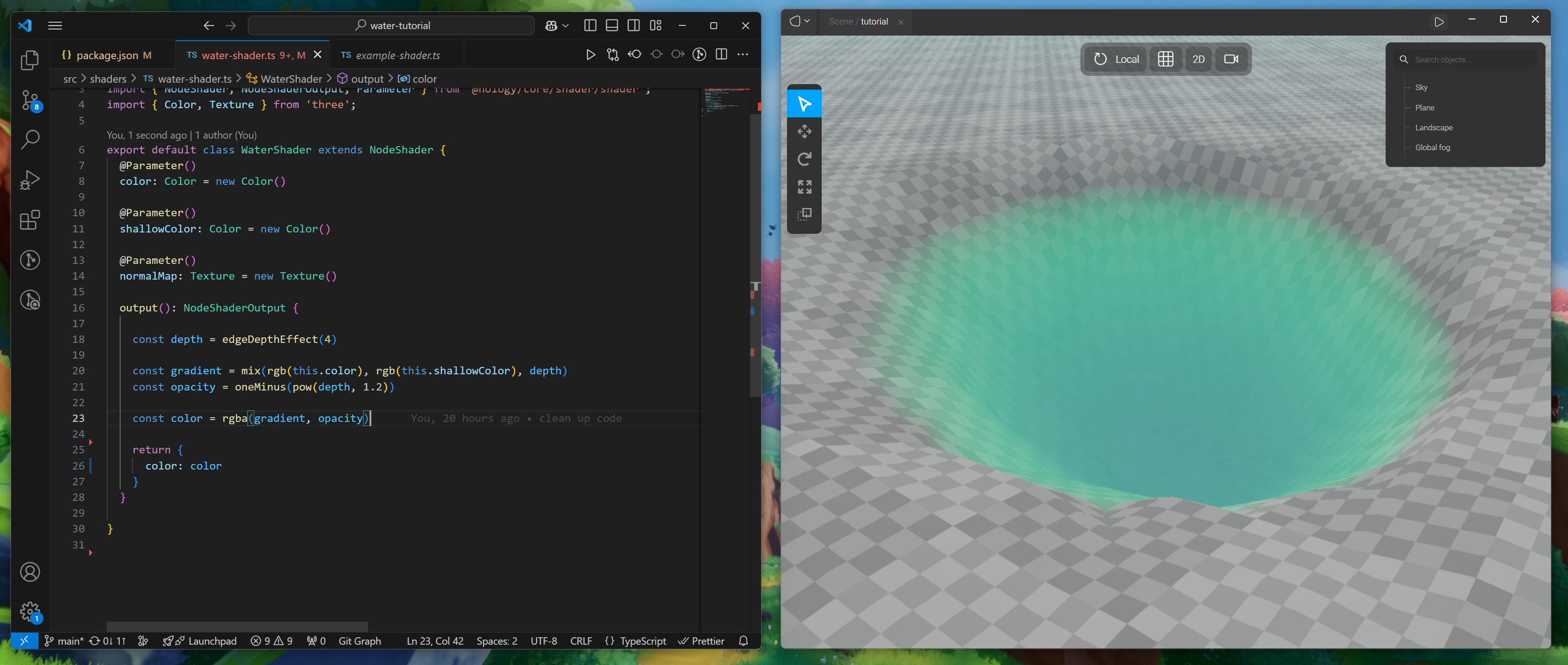 Water is often transparent so we will adjust the opacity value of the color. To add to the appearance of depth, we will utilize the depth value again so that the water becomes less transparent when it is deeper.