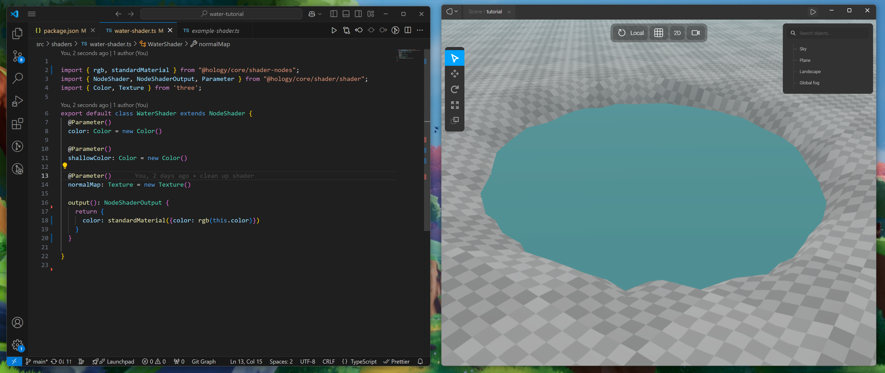 Now that the scene is prepared, we can go back into the shader code. Whenever you make changes to the shader code, it will automatically update the material in the Hology editor. It can therefore be useful to have both the code editor and the Hology editor open side by side.