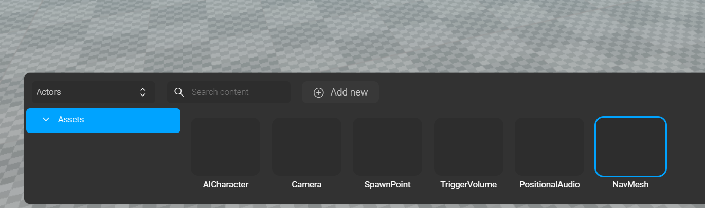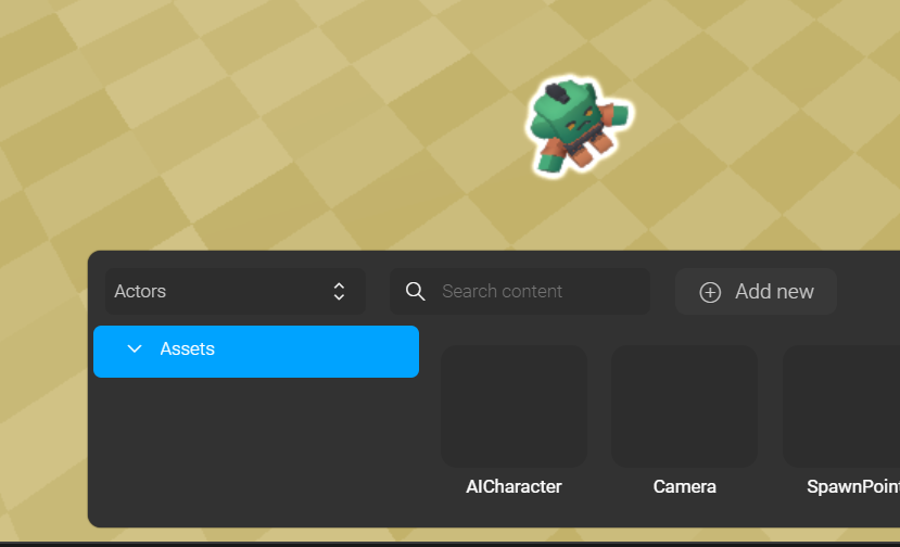Select Actors in the asset browser where you now should find the AICharacter actor. Click and drag this into the scene to place it. Ideally, place it somewhat nearby the spawn point so that when playtesting, you will be able to find it. In case you don't find the AICharacter, ensure that it is exported in the file src/actors/index.ts. Also, ensure there are no compilation errors in your actor code.
